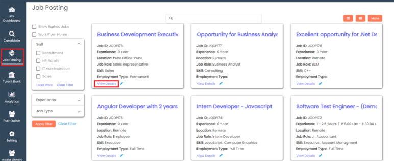 Go to **Recruitment** >> Click on **Job Posting** >> Click on **View Details**.